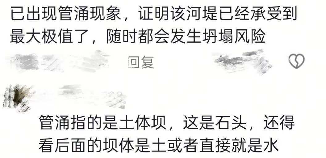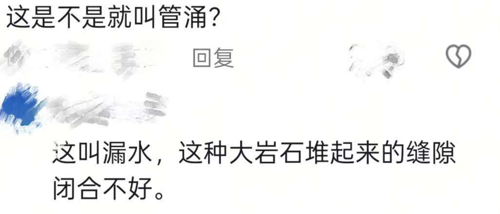 评论区有网友称这面石墙为堤坝,这种情况很危险;也有网友表示只是一面本身存在缝隙的石头墙,是漏水;另有网友认为,可能存在管涌风险。