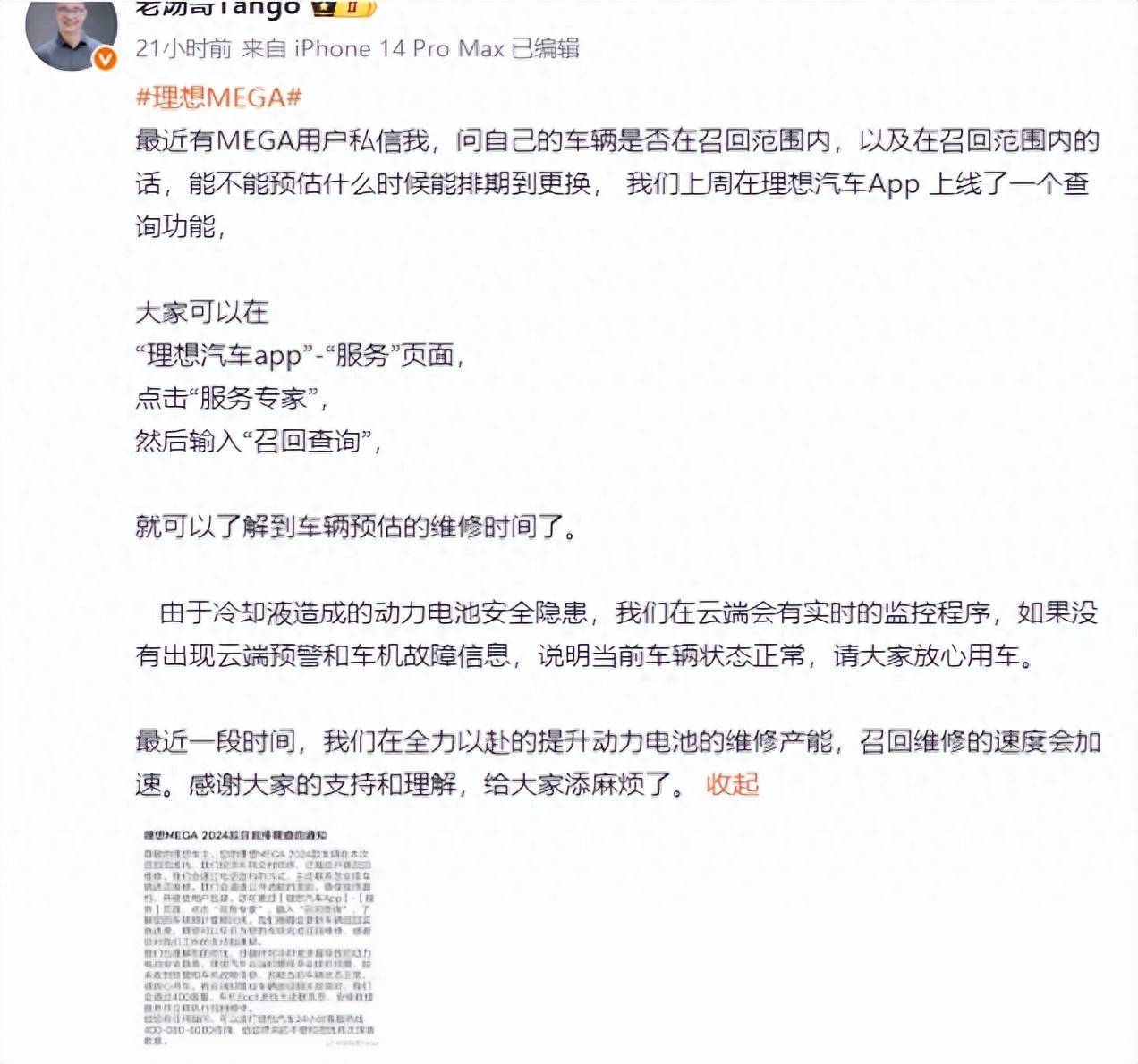 关于目前的召回进展,理想汽车产品线负责人汤靖今日发文表示,理想汽车 App 上线了一个查询功能,车主在“理想汽车 App”-“服务”页面,点击“服务专家”,然后输入“召回查询”,就可以了解到车辆预估的维修时间了。